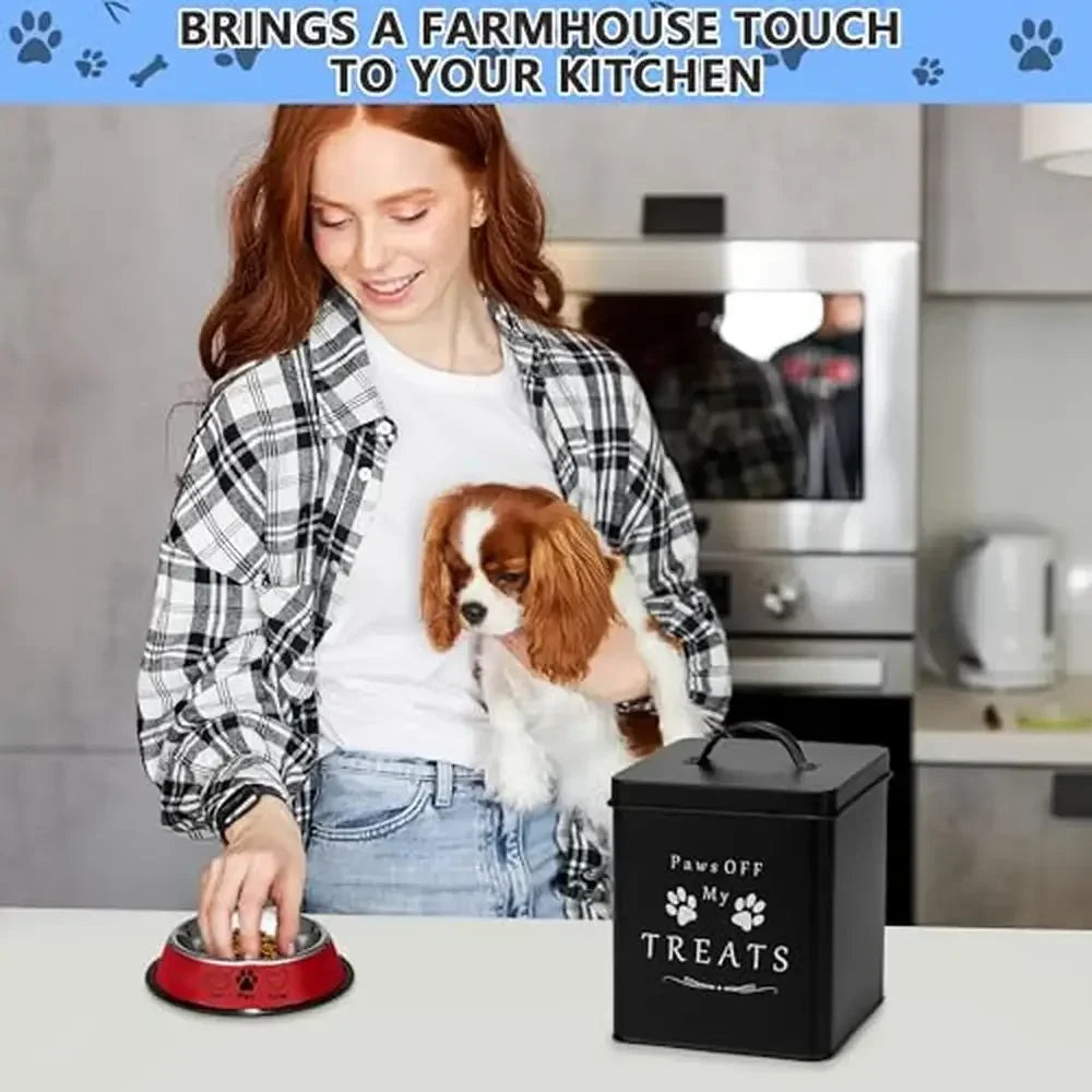 - Four-item set: Large metal dog food bin with a tight lid and side handles, a metal treats container with lid, a convenient food scoop, and a glossy red pet bowl (4.5" diameter).